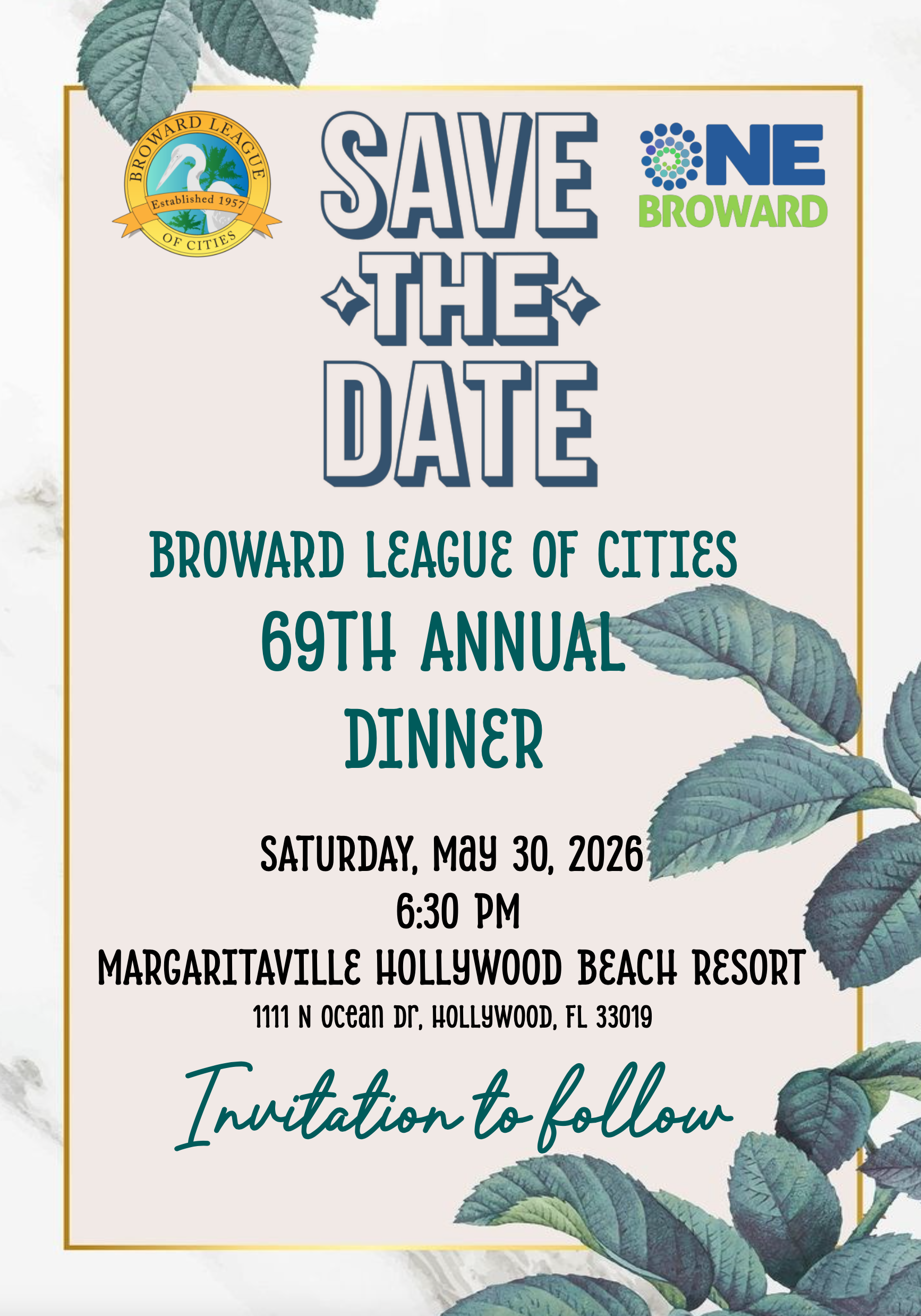 We will have a fantastic evening sharing with good friends and colleagues, committed to the leadership and great work of the Broward League of Cities!